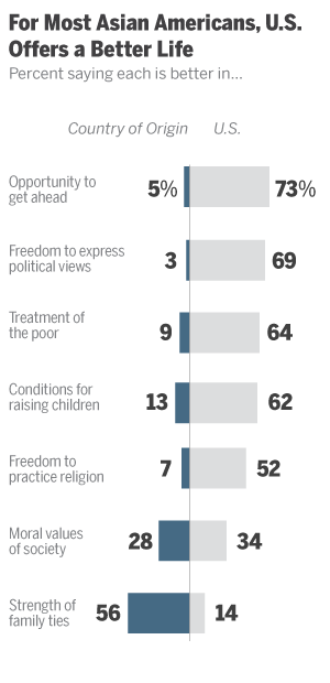 7)亞裔對美國的多個方麵感到滿意,但在道德價值觀和家庭關係的緊密程度上,認為不如自己原來的國家。