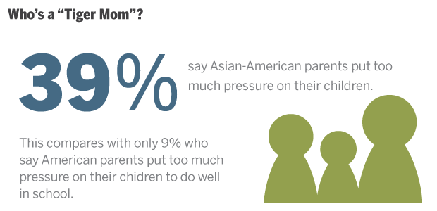 3)近40% 的人認為亞洲父母給孩子太大的壓力。這麽評價美國家長的隻有9%。