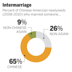 12)在結婚伴侶的選擇上,65% 的華人還是選擇了華人。9% 與其他亞洲人結婚,26% 的人與非亞裔結為伴侶。