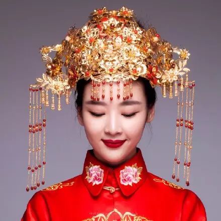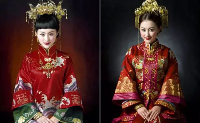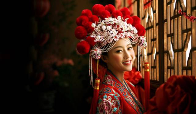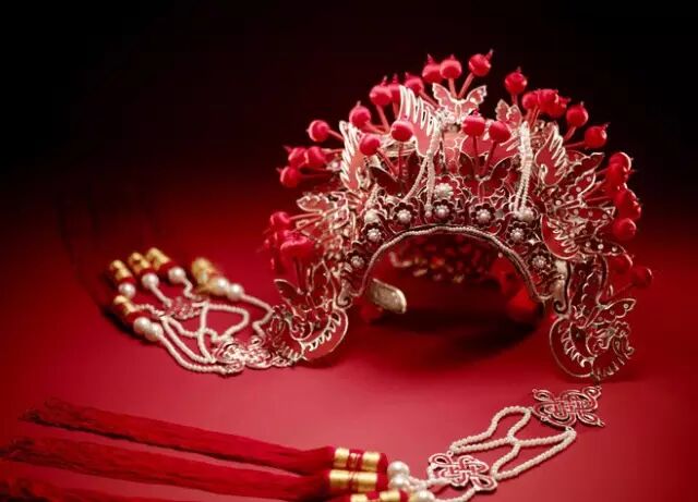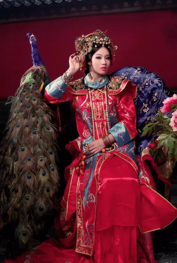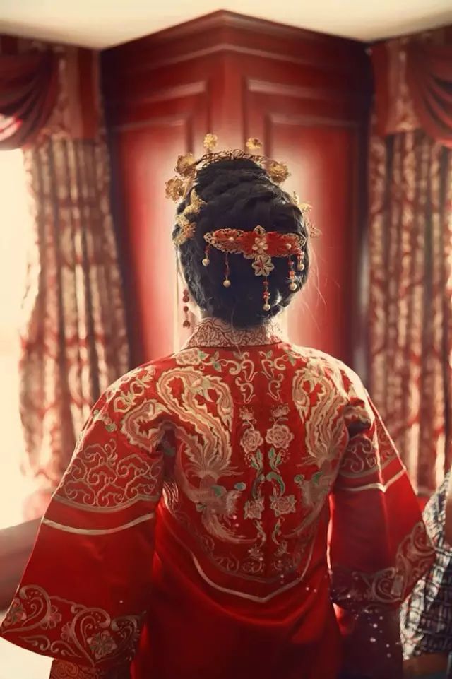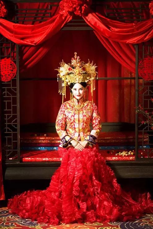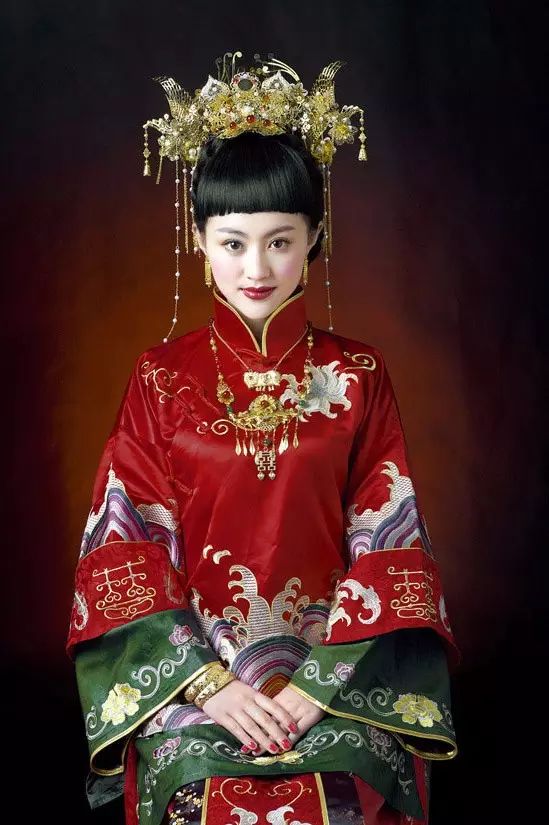 一襲輕盈羅帳纏綿的妝台前,一方銅鏡映襯出伊人的嬌影。簪花披紅,纓絡垂旒,眼波流盼間閃爍著奪目光彩,舉手投足裏流露出萬千氣象。自古至今,虹裳霞帔始終是出嫁女子最絢麗的裝扮,在清淺的燭光裏熠熠生輝,照亮了伊人生命中的重要時刻,美妙絕倫,豔冠古今。