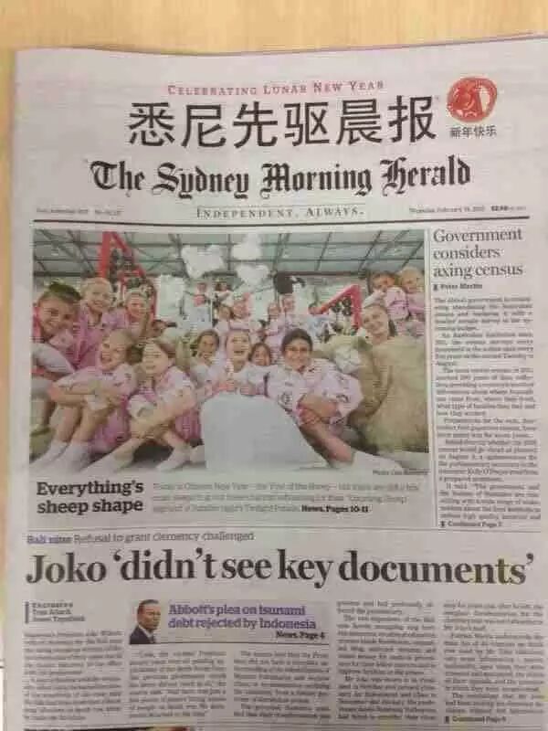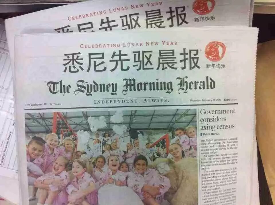 大年初一到了!小編先給在澳華人、祖國的小夥伴們,以及漂泊在天涯各處的華人同胞還有所有愛過中國年的外國朋友們拜年啦!勤勞的小編一早起來就看到朋友圈被Sydney Morning Herald據稱有史以來第一次的報紙中文抬頭給刷屏了!