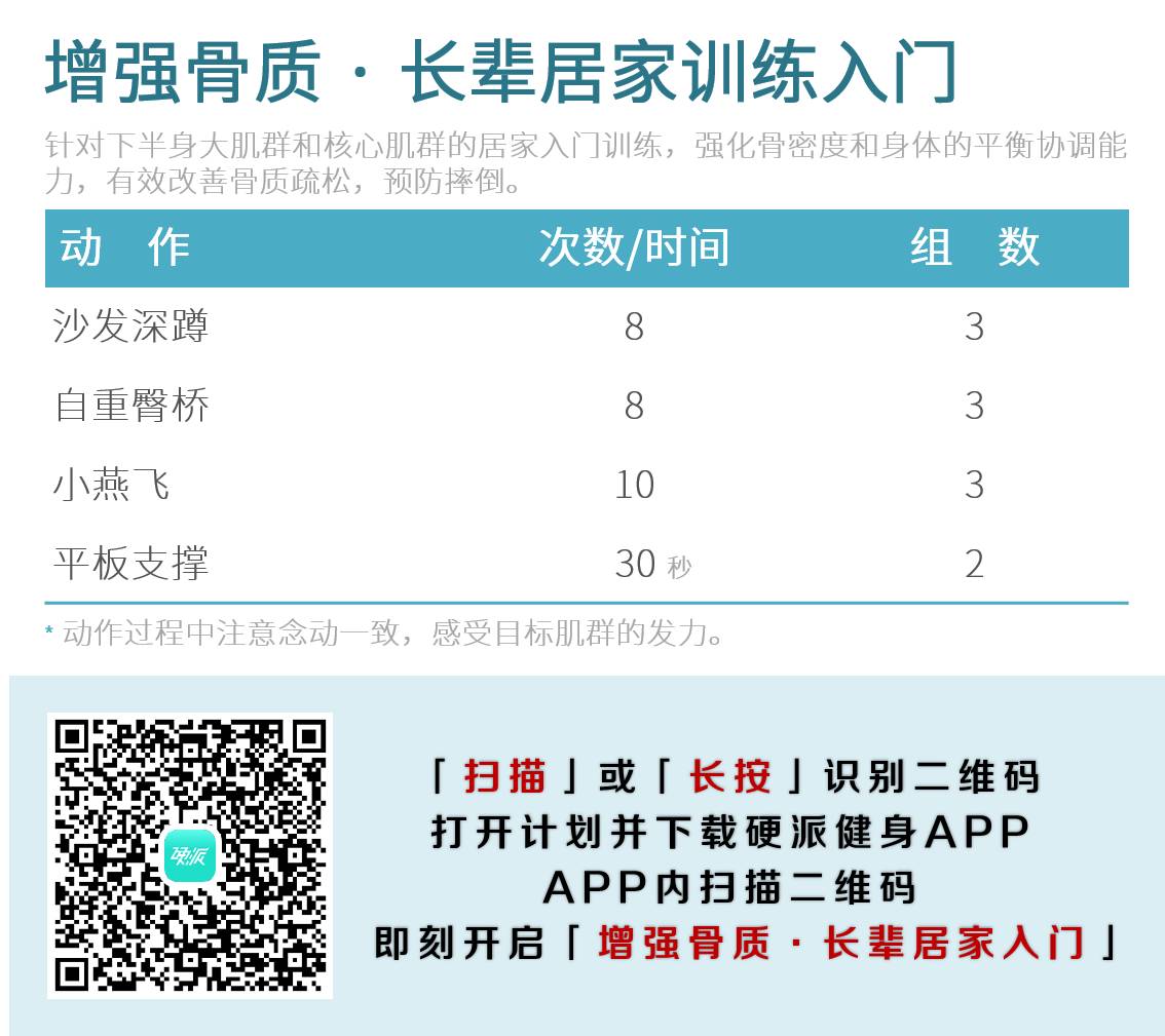 最後是給父母的居家入門訓練,一周訓練2-3回,再結合飲食和戶外運動,可以很好的增強骨密度,預防骨質疏鬆和摔倒哦!