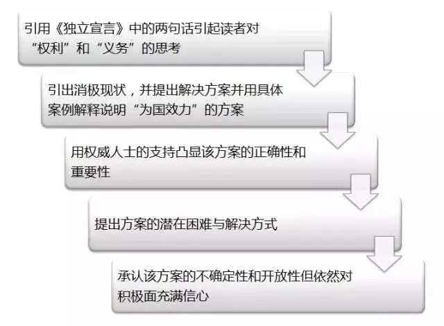Contrast對比:作者在文章使用了多組對比。從《獨立宣言》引用的兩句話本身就形成鮮明的對比,一個是always remember另一個是often forget;一個是rights另一個是obligations;作用是強調人們如今記得更多的是權力而忽略了責任和義務,突出文章主題,引起讀者共鳴,並為下文號召人們為國貢獻做鋪墊。