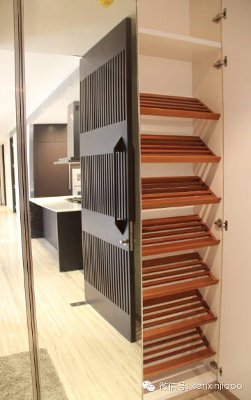 一出私家電梯,左手邊便是女孩子見到會尖叫的——嵌入式超多層鞋櫃!鏡子的設計使得屋子看起來超大超寬敞超明亮……(我是不是用了太多形容詞了?)