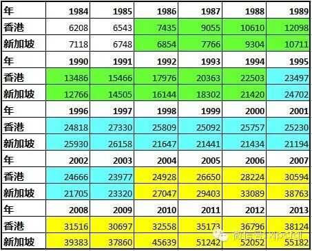 可以看出在1994年前香港的經濟發達程度高於新加坡;1995至2003年兩個經濟體持平;2004至今的十年間新加坡開始超過香港,自2007年開始香港被遠遠地拋在後麵、2013年的差距高達45%!
