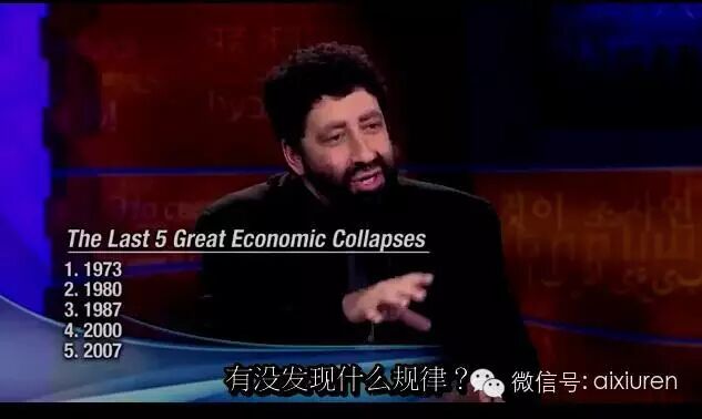 Jonathan: 是的,非常奇妙。若你查看,這裏有一個例子。若你回看過去40年,我們國家的金融史,會發現5個重大轉折時點,或者長期衰退的起始崩潰點。什麽時刻發生的呢?先給你一個例子:1973年,第一個; 1980年,第二個;1987年,第三個;2000年,第四個;2007年,第五個,是大蕭條。有沒發現什麽規律?他們每個之間都相距7年,我的意思是: