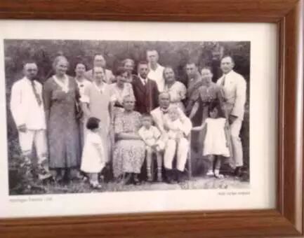 辛·大衛指著賓館牆上的照片,講述這個賓館的曆史,其中一張照片是一百年前他們家族的合影。