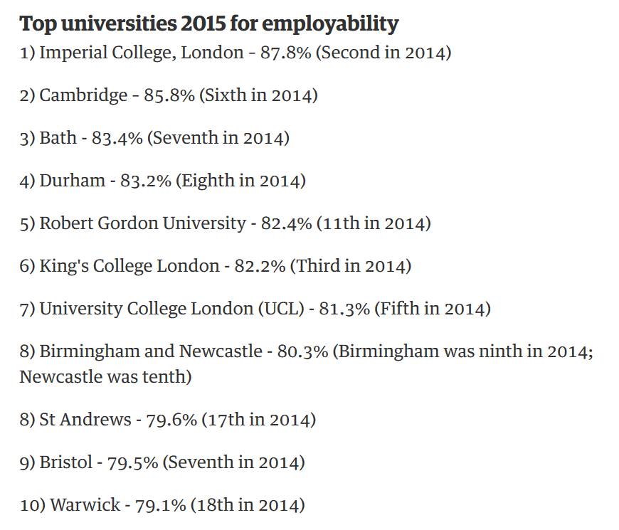 根據英國大學完全指南(The Complete University Guide)統計出英國大學畢業生就業率排行榜,帝國幹掉劍橋!居榜首!調查顯示,倫敦帝國理工學院2013年畢業生,離開大學六個月之內找到專業工作或繼續讀研的比率高達89.9%!!!