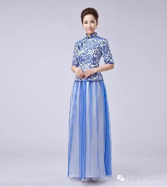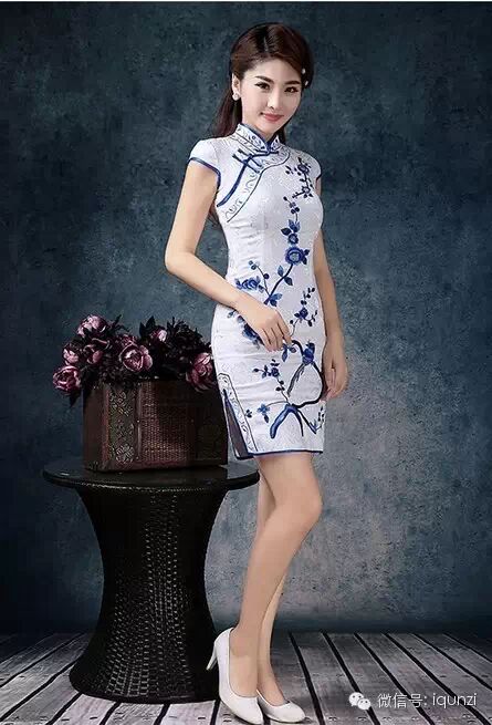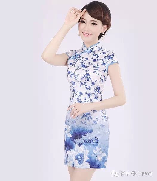 『時尚短評』複古中式青花瓷旗袍,傳統的青花紋樣,白底淺藍色花紋,淡雅時尚,裙身刺繡,性感而時