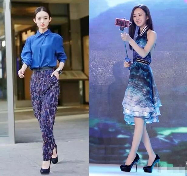 藍色調是夏日經典,給人視覺涼爽感,高腰花紋褲搭配藍色襯衫,穿出帥氣高挑身姿;一條藍色花紋裙,趙麗穎演繹出無限柔情與甜美。