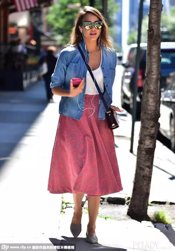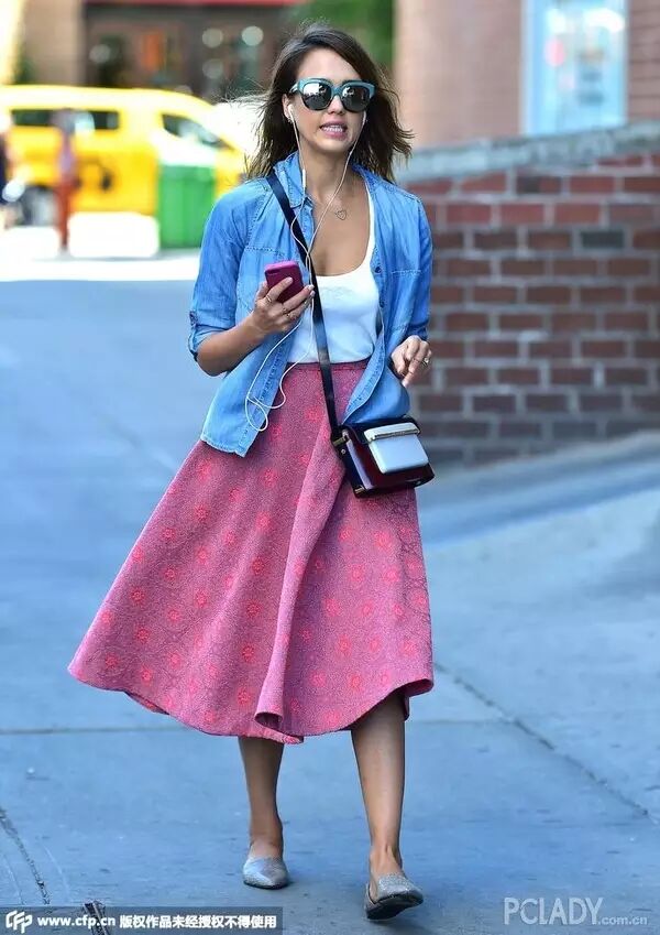 傑西卡·阿爾芭佩戴鏡麵墨鏡,身穿牛仔襯衫,內搭白色背心,斜背拚色迷你包,下配印花過膝裙,腳踩尖頭平底鞋現身街頭。
