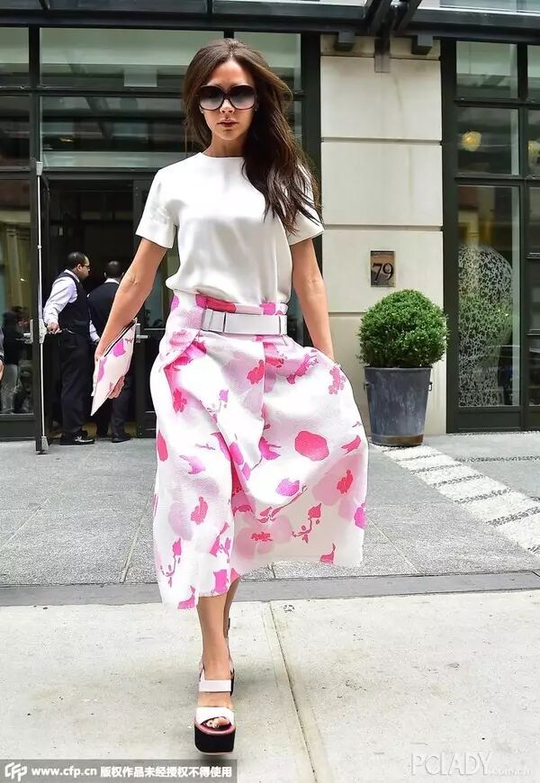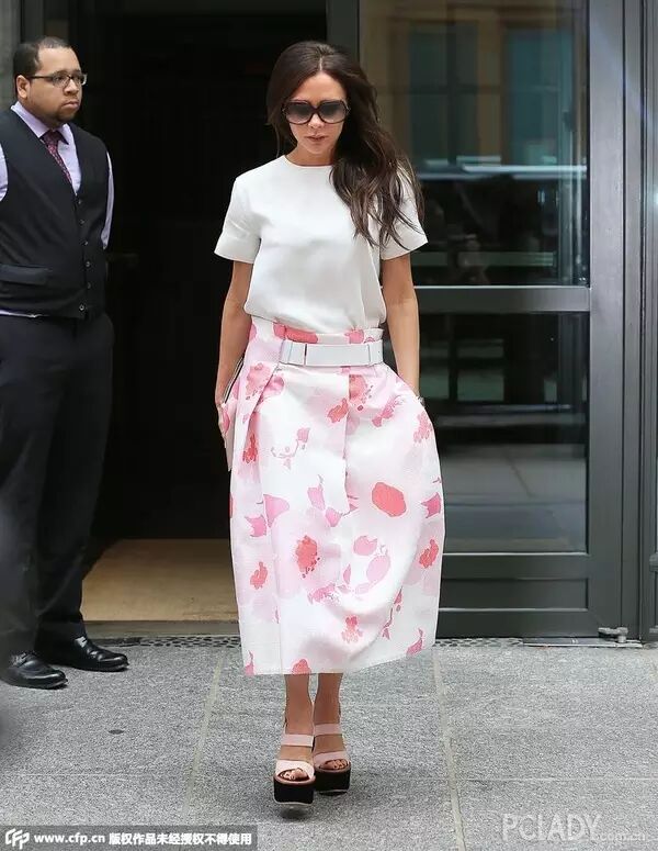 不同於往日的冷酷裝扮,這一次出街貝嫂一襲粉白印花過膝裙充滿夏日氣息,粉嫩甜美。