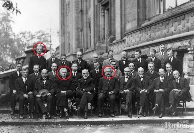 1927年10月召開的索爾維會議雲集了諸多諾貝爾獎獲得者,其中貝朗特的祖父奧古斯特·皮卡爾(三排左一)是當時最著名的物理學家之一。紅色圓圈中的人物分別是奧古斯特·皮卡爾、居裏夫人(一排左三)、愛因斯坦(一排左五)。