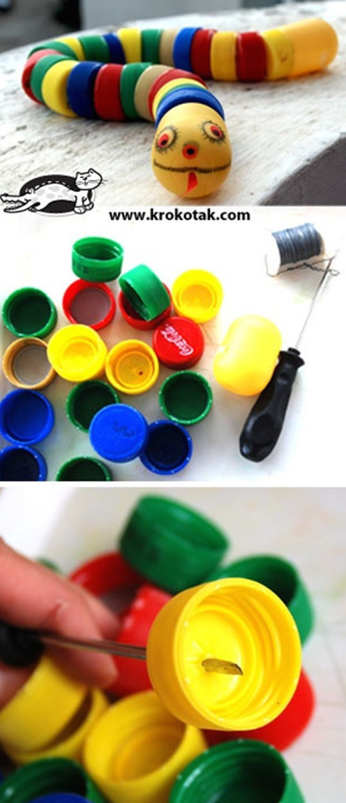 把瓶蓋用鐵絲穿起來,一條小蛇就做好啦