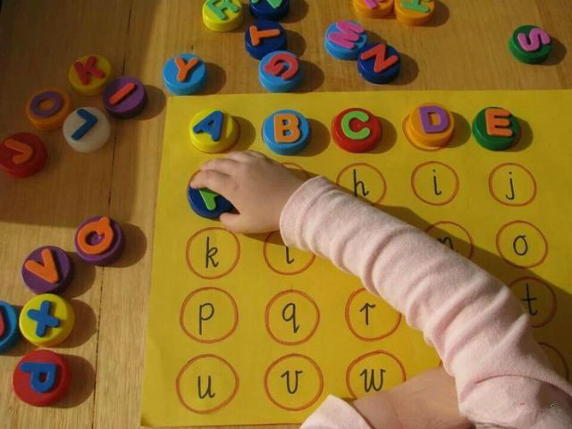 在瓶蓋上貼上字母,用來做字母配對遊戲吧,最喜歡這種不用花錢又好玩的玩具啦!