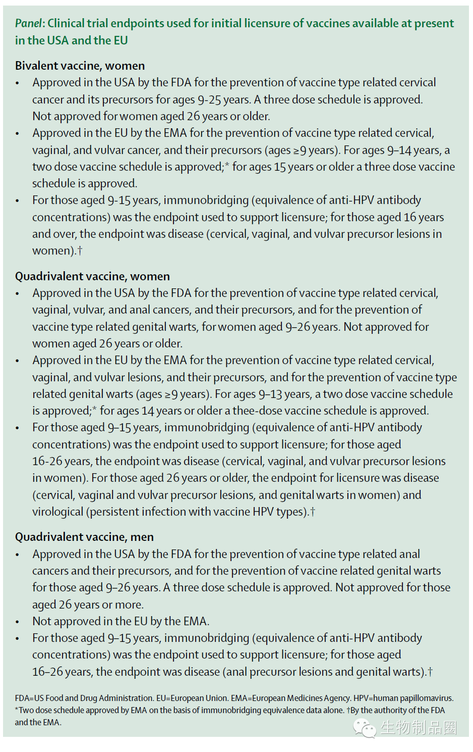 盡管現有HPV疫苗對於HPV靶向的感染和疾病有很高的保護效應,目前仍然需要新的疫苗研究。這些研究目標可以包括疫苗接種次數和方式的改變,二代疫苗的開發,以及區域生產商對於生物類似疫苗的開發(莫非說的是中國?)。作者總結了現有有關HPV疫苗研究研究終點的思考,這些研究終點由International Agency for Research on Cancer和美國National Cancer Institute 在2013年9月召集的專家組進行探討和總結。用於預防宮頸癌的上市有效性研究應用CIN2+作為疾病終點。根據這些研究的的經驗和現有HPV感染的知識,未來新疫苗的有效性研究可以以HPV持續感染的終點進行安全性改善。HPV持續感染在CIN2+中更常見,作為主要終點更易重複。免疫橋性研究(immunobridging trials)能夠充分地證實替代性接種針劑研究免疫性非劣勢特點,從而將26歲以下的年齡、生物類似性疫苗和上市後監測確認的效應聯係起來。這些推薦用於推動疫苗的持續開發,並確保恰當的安全性和有效性評估。