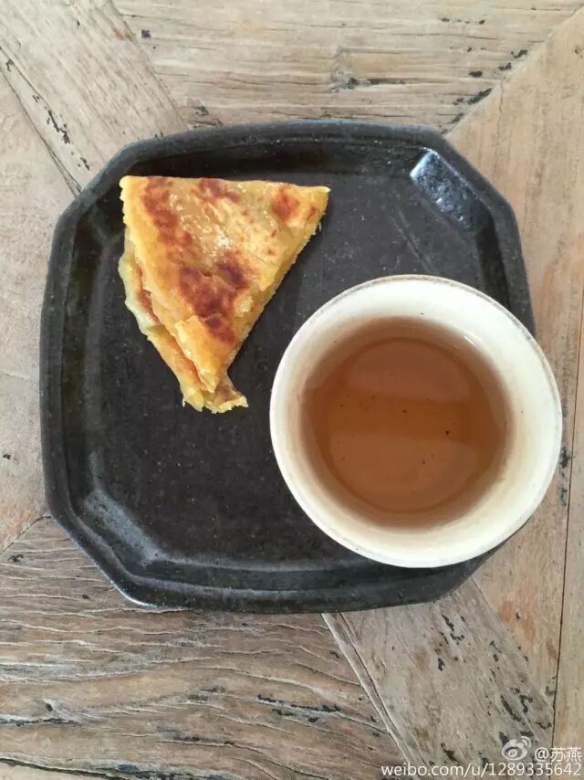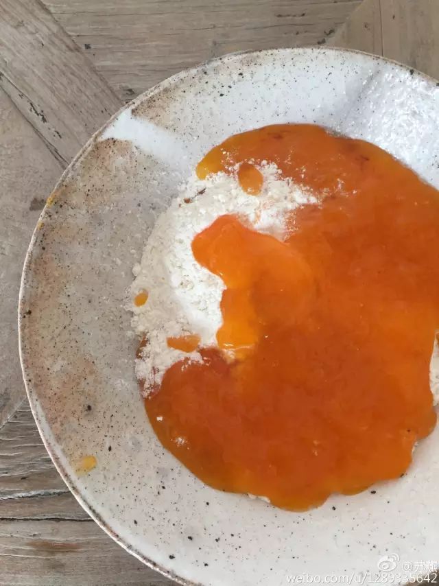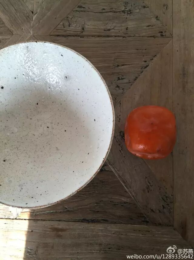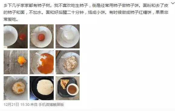 “鄉下幾乎家家都有柿子樹。我不喜歡吃生柿子,倒是經常用柿子做柿子餅。麵粉和去了皮的柿子和麵,不加水。麵和好後醒二十分鍾,烙成小餅。有時候做成柿子紅糖餅,果果非常愛吃。”