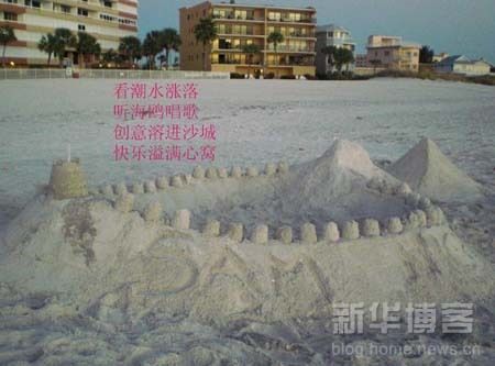 | 童 趣  走在海灘上,任海風拂麵。海灘上有遊人們留下的 腳印,也有海鳥們留下的足印。每逢節假日,海邊就是遊人們來旅 遊和度假的好地方。海灘也是孩子們所喜愛的地方。他(她)們會 帶著遊泳衣,在淺海處遊泳。有的時候還會放起風箏。在玩累了的候.孩子們 就會把小鏟子和小水筒拿出來,用沙子堆成小城堡。我看著一 個小女孩,穿著粉色的遊泳衣.手裏提著一隻小筒,在海邊跑 來跑去,一麵用小筒盛上海水,一麵再把水倒進沙坑。看著小女 孩不知疲倦的樣子,我的情緒也受到了感染。我不由想起自己 小的時候,很喜歡玩軟泥。剛從坑裏挖出的軟泥,很有柔韌 性。放學後,有時候我和幾個小同伴一塊玩摔軟泥。首先是把手中的一塊軟泥 按 成碗狀。然後口裏一邊問話,一邊在把泥倒扣在地上。“有沒有窟窿”?如果答錯了,就會把自己手裏的軟泥給對方一塊。很多的時候,自己會為贏來的一大塊軟泥 而高興。貪玩的時候,有時還會忘記回家吃晚飯,害得祖母到處找。想著自己童年的樂趣,再看看眼前的小女孩,漫過了鞋子的海水真涼.我不禁打了一個寒噤。 “小女孩,你不覺得冷嗎?”我帶著笑問道:小女孩揚起稚氣的臉,回答到:“不冷。”女孩旁邊的媽媽笑著說:“小孩子從來都不會覺得冷。”是啊,小女孩用自 己的雙手辛勤的勞動著,運動驅除了寒冷,創造帶來了歡樂.小女孩的那種活潑歡快的樣子,使我的情緒也受到了鼓舞,原來童心是那樣的單純可愛,他(她)用自 己的辛勤勞動,築成了一個個小小的沙城,給遊人們帶來了快樂,也在沙灘上留下了一個美麗的造型。 | |