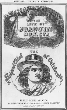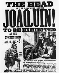 曆史記錄裏Joaquin在1830年左右生於墨西哥的Sonora。在1850年左右,他和自己的哥哥Jesus Murrieta(看看人家這名字)還有他老婆的三個兄弟移居到美國加州,有證據表明一開始他從事的是捕捉野馬的工作(野馬mustang是歐洲人帶到美國的馬逃到野外,自然交配產生的品種。西部牛仔們經常從野外逮一些,馴化好了再賣。二戰美國一種傳奇戰鬥機的代號就是Mustang,後來被福特用來命名他們的汽車,到今年福特野馬已經生產了半個世紀,也算一個傳奇了,扯太遠了,打住)。