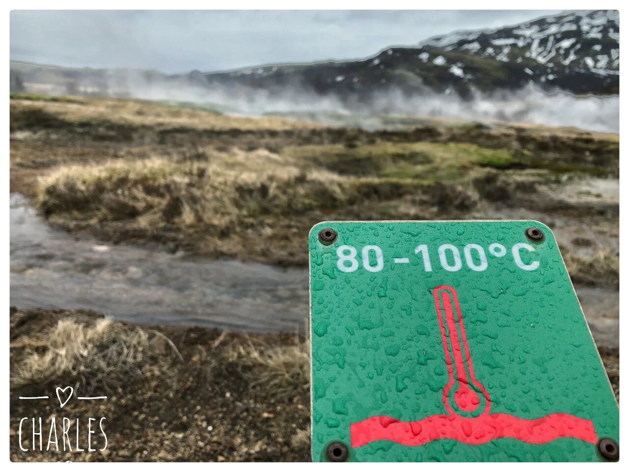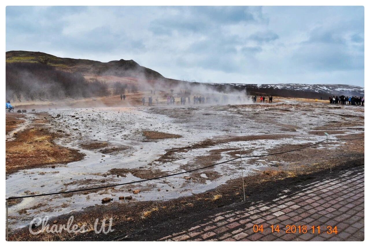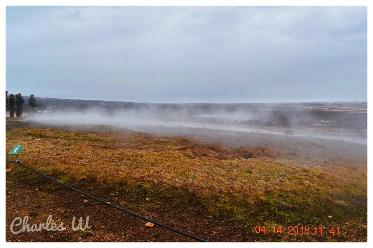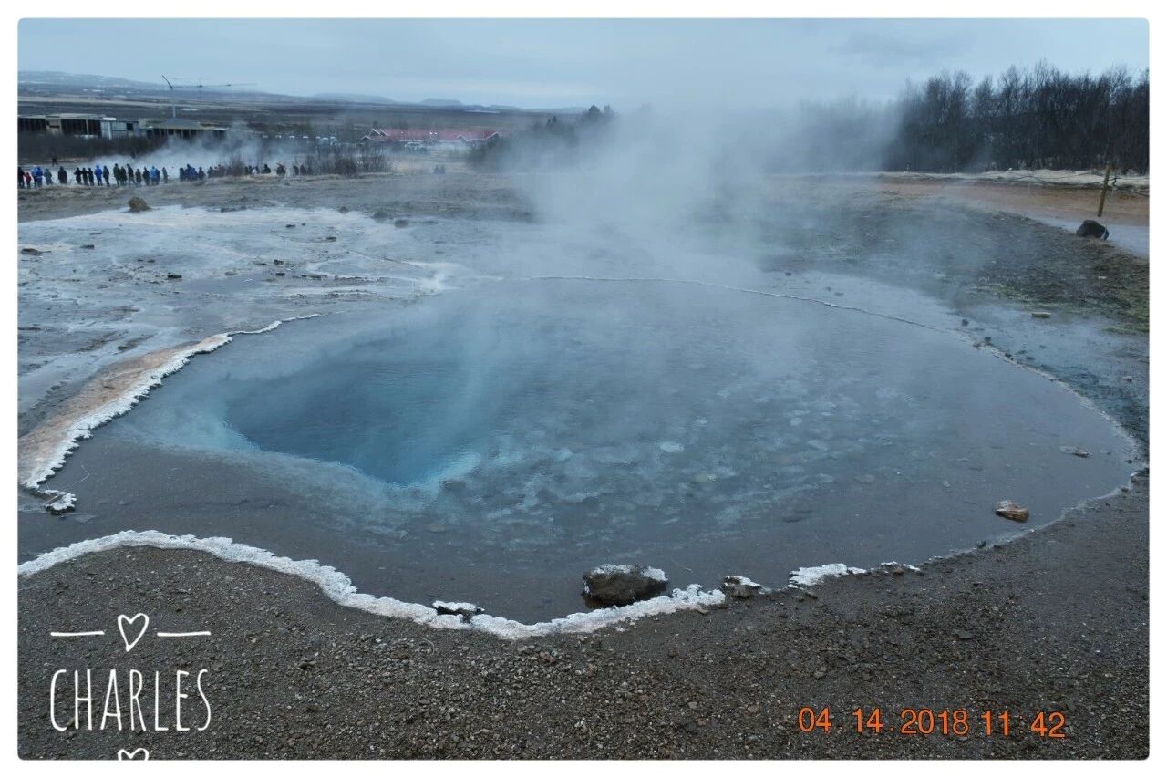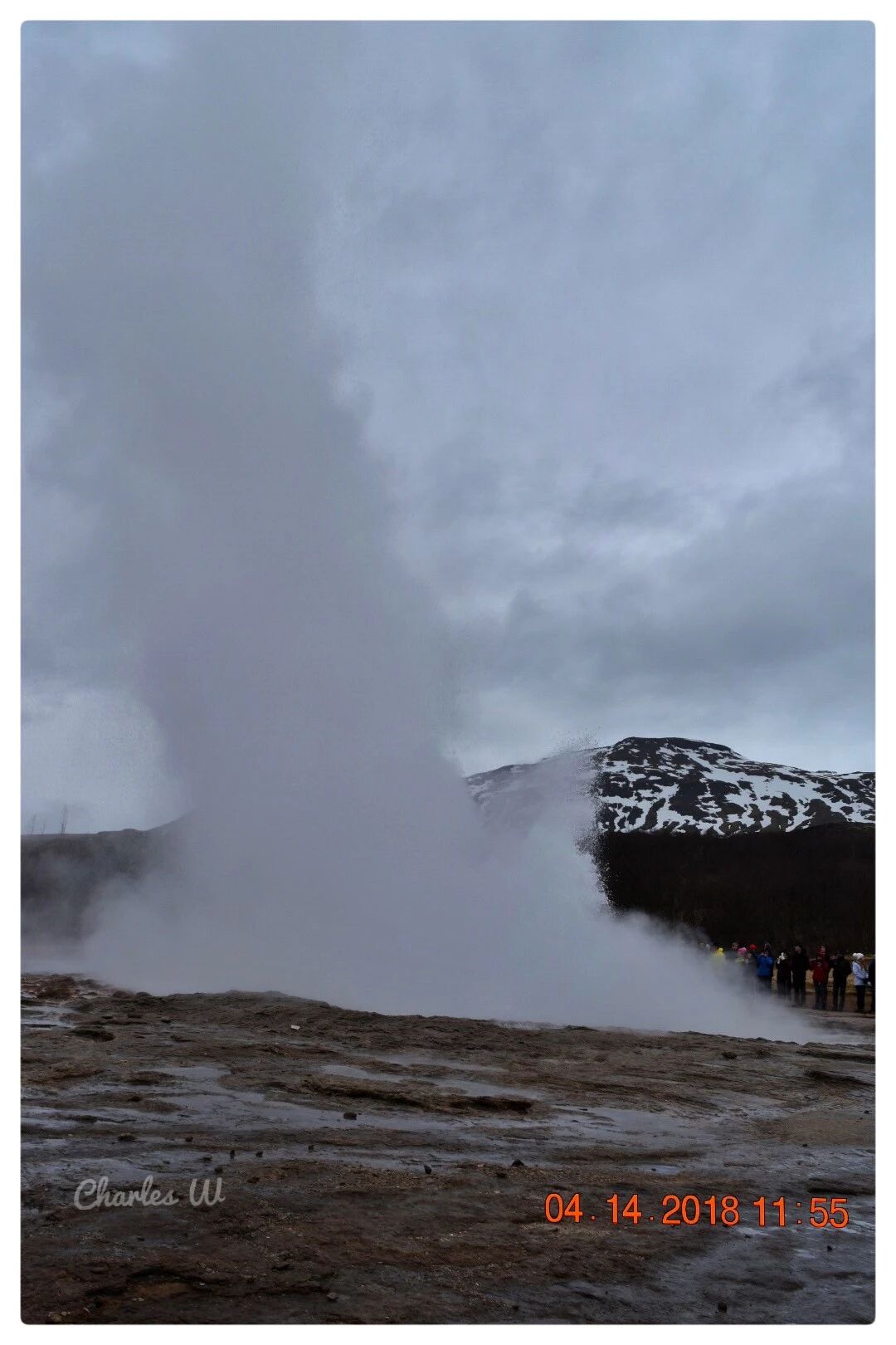其中之一熱噴泉(間歇泉)會在每4-5分鍾向天上噴一次,持續不到一秒中,水是沸騰後噴出的。見視頻。這個噴出的溫度可達125攝氏度,它通常噴出的高度是15-20米,但有時可能高達40米。所以要小心不要靠的太近。這個熱噴泉名字叫Strokkur (冰島語為 The Churn)。