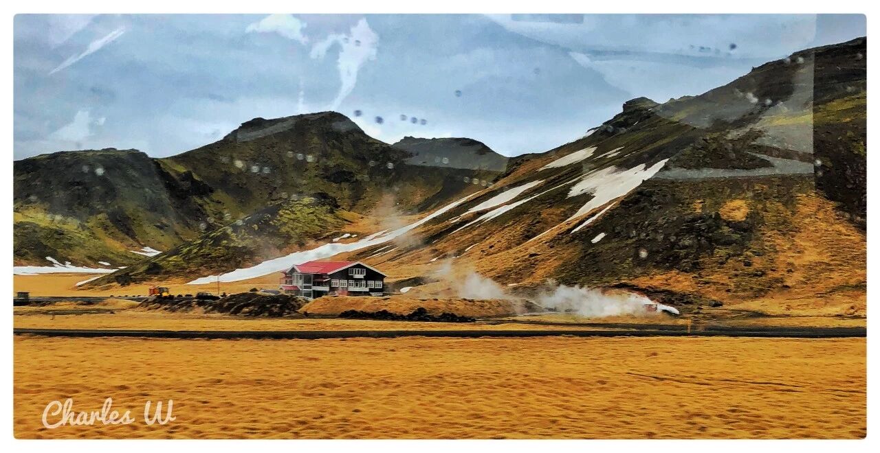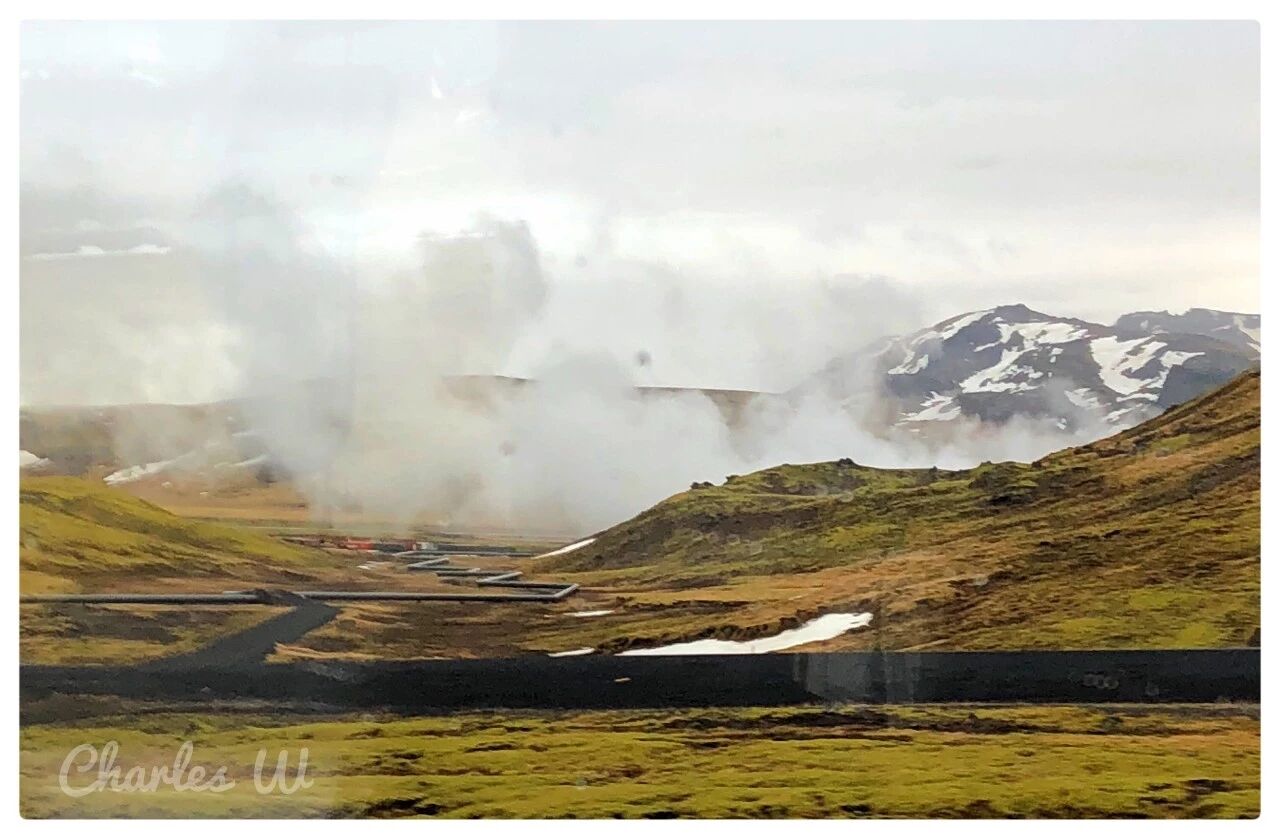可以看到地下冒出的蒸汽, 後麵是雪山。