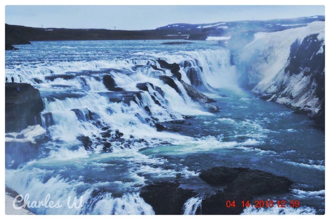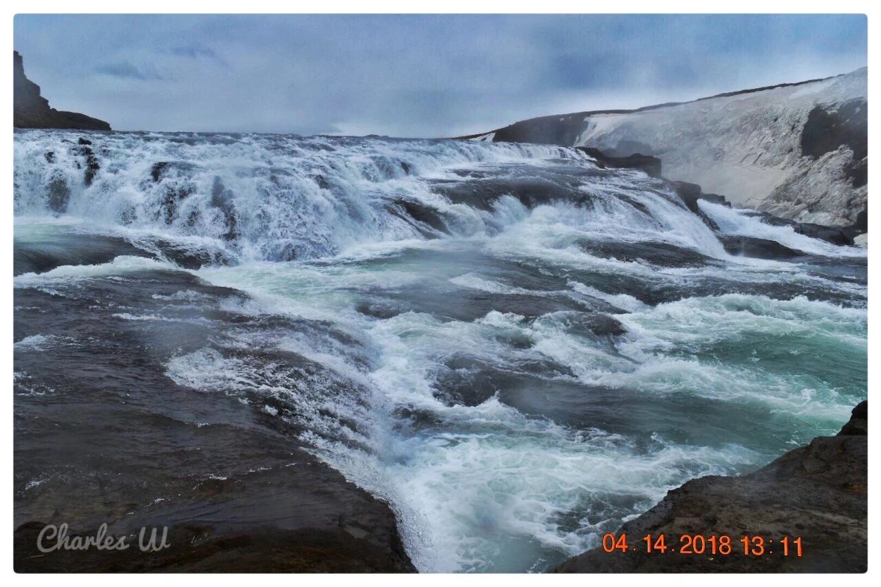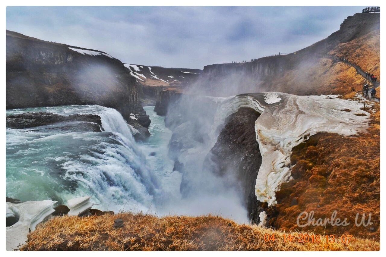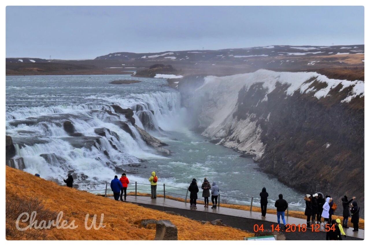 Gullfoss 冰島語意為金色的瀑布(golden fall), 沿著Hvita 河上,乃冰島最值得參現的瀑布,既優雅又壯觀。有太陽時,常有彩虹。陽光反射照在水中金光閃閃。我們來時沒有陽光。