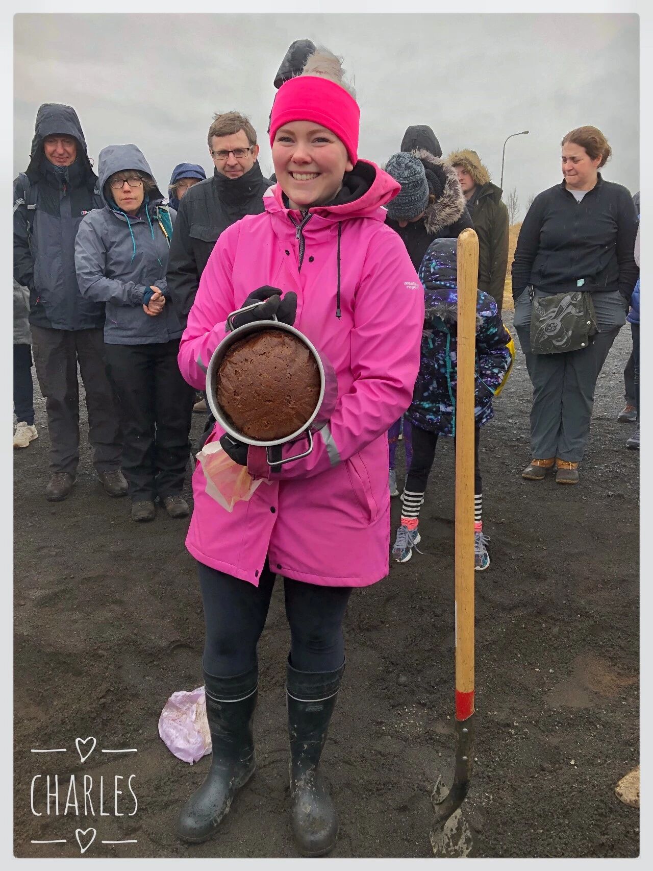 放上一厚土,24小時後(第二天),挖出,打開後熱蛋糕就做好了,