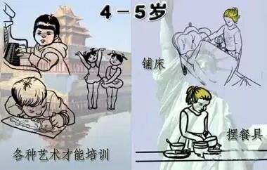 4-5歲:不僅要熟練掌握前幾個階段要求的家務,並能獨立到信箱裏取回信件;自己鋪床;準備餐桌(從幫家長拿刀叉開始,慢慢讓孩子幫忙擺盤子);飯後把髒的餐具放回廚房;把洗好烘幹的衣服疊好放回衣櫃(教給孩子如何正確疊不同的衣服);自己準備第二天要穿的衣服。
