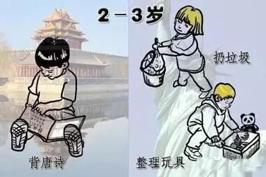 2-3歲:可以在家長的指示下把垃圾扔進垃圾箱,或當家長請求幫助時幫忙拿取東西;幫媽媽把衣服掛上衣架;使用馬桶;刷牙;澆花(父母給孩子適量的水);晚上睡前整理自己的玩具。