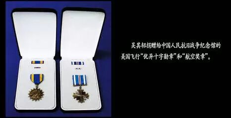吳其軺生前捐贈給中國人民抗日戰爭紀念館的美國“飛行優異十字勳章”和“航空勳章”。