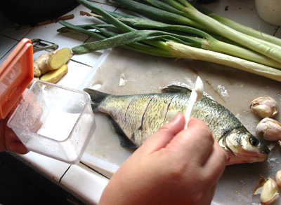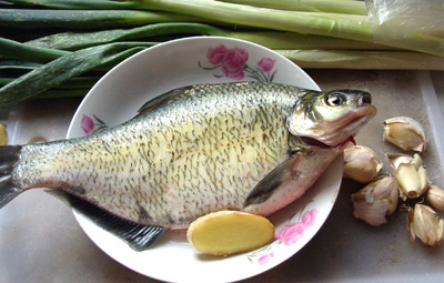1.買來了一條八兩重的鯿魚(感覺太小了,小時候釣魚如果釣到這種都是會放生的,可惜市場上已經很少能見到老家那種2--4斤多的大鯿魚了,其實如果有長江裏那種三角鯿就最佳了,估計兒時的好東西都滅絕的差不多了)必要的薑,蔥,蒜.