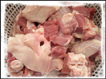 順 便說一下洗大腸的方法:將買回來的大腸放入盆中到入一些麵粉(稍微多放一點)和鹽、一瓶啤酒來回揉搓,直到大腸上的汙物洗淨後放入水槽中,用流動水衝洗大 腸,直到大腸上的麵粉洗幹淨為止。接下來將鍋中放水,放入洗淨的大腸,再放入料酒、薑片(目的是為了去除大腸上的腥味)煮至沸騰(也就是飛水的意思),取 出大腸;