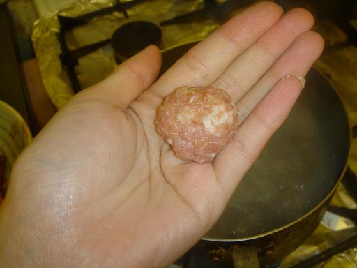 3、加適量水,煮沸,然後把豬肉餡捏成一個一個圓圓的小丸子,下進鍋裏.丸子是這樣的。