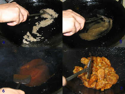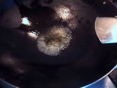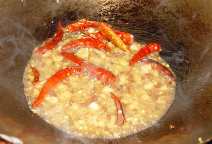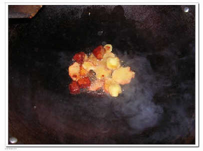 7.下鍋拉,油燒冒藍煙後,下入配料煸香,火不能太大,主要是炒出香味.