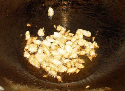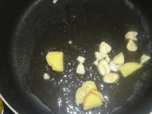 2、加少許油在鍋裏,燒熱,蒜片、薑片爆香。