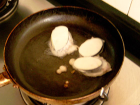 5.將加過麵粉(定形)後成的土豆餅雛形放進平底鍋裏炸,記得用小火來做,否則會影響土豆餅的色澤。