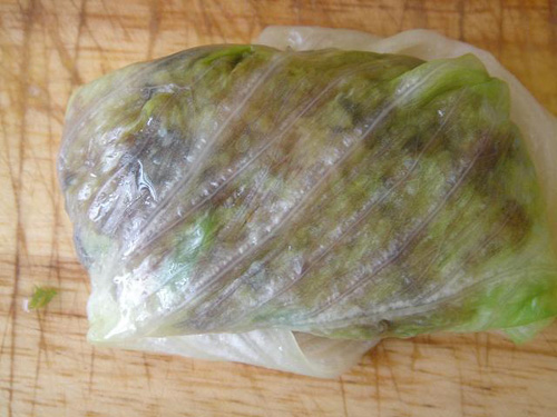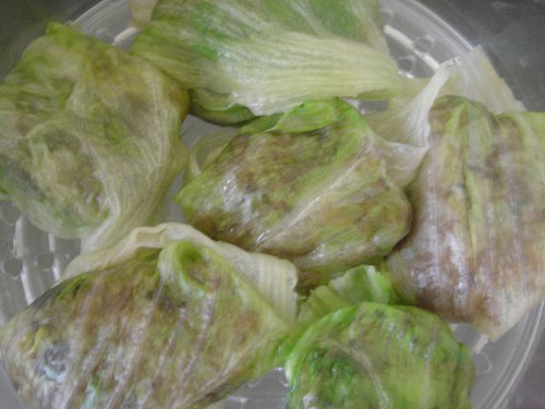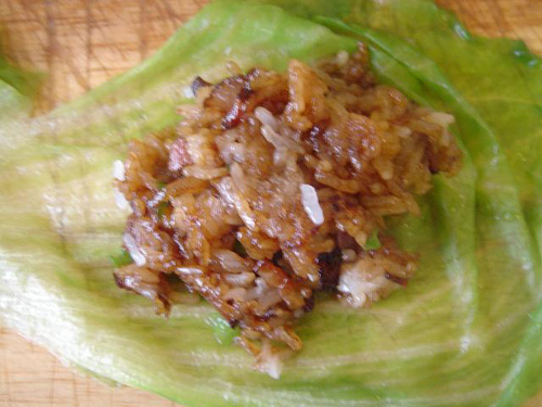 6、取半片煮好的生菜葉子,適量炒好的糯米