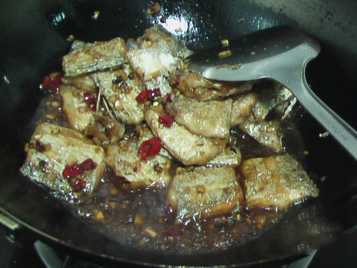 4、倒入炸好的帶魚塊,翻勻,稍燜兩分鍾入味。