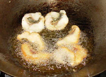 1、洗淨剁塊,拌入少許生粉或麵粉,入鍋炸至表麵金黃