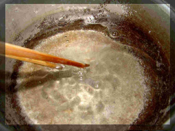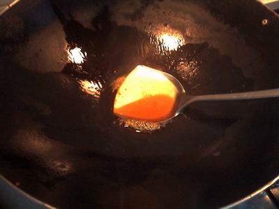 2、不停地用炒勺攪動,使白糖溶化,變成紅棕色的糖液,這也叫炒糖色。