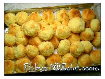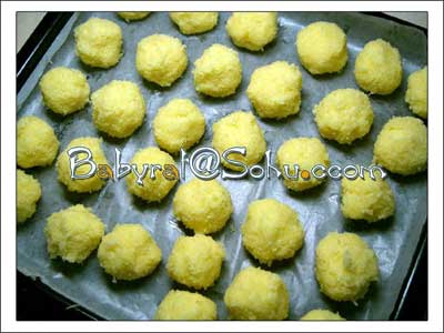 將 拌好的椰蓉團搓成小圓粒(整個製作過程就數這一步最不爽了,好油好黏人喲,隻能忍了,椰蓉團比較散,用一次性手套或者是塑料袋不好做),把小圓粒排於烤盤 中入預熱好的烤箱中。上下火120度(我覺得有點低,家用烤箱的溫度可能達不到要求,所以我用了140度)烤到小圓粒變成金黃色就好了,我用了35分鍾 吧!
