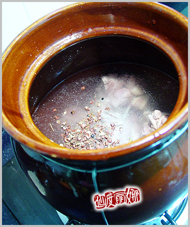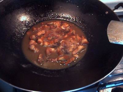 12.然後就可以放一小碗水(家庭沒有高湯)開始煮——飯店裏火大油多,人家甚至全用油烹熟,家庭就用自己的做法咯!水開後加入最重要的黃酒+醬油,是個去腥調味染色的步驟!