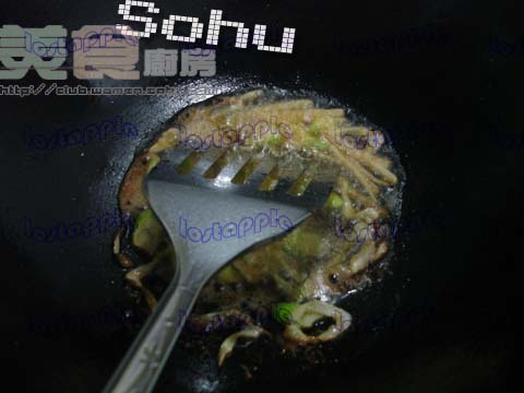 4、薑蒜香味炒出後,加入醬油適量,白砂糖適量,料酒少許 快要起鍋時,放入蔥絲,翻炒 加適量鹽。