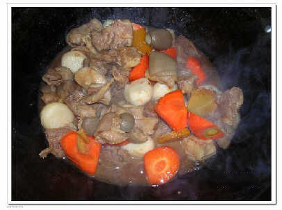 3、在加入已炒過的羊肉,不停的番炒,加入少許的酒、醬油、片糖、鹽、適量的水煮15分鍾。