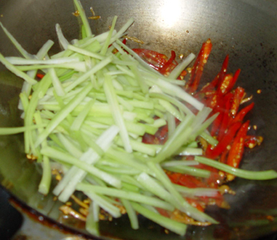 3、炒香泡椒絲,放芹菜絲翻炒