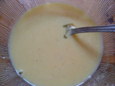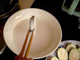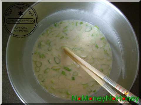 4.倒入調好的牛奶雞蛋汁,加適量麵粉,拚命地攪啊!