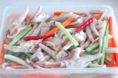 做法:把鳳爪洗淨,放開水鍋裏煮不超過十分鍾,用筷子能穿透就可以了,撈起過涼開水,放保鮮盒裏,舀入老壇子裏的泡菜水,淹過鳳爪,順便撈幾個泡辣椒,再切點西芹片一起泡,放冰箱裏兩小時後就可吃了。