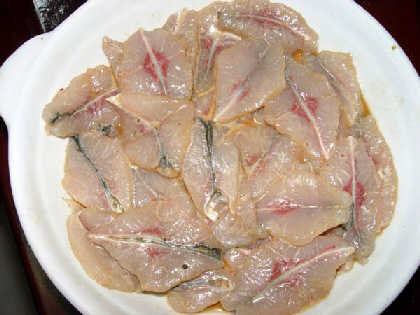 4.因為魚小,所以沒必要做十字花,斜片3刀就可以了——注意是斜向切入肉,不是直切!