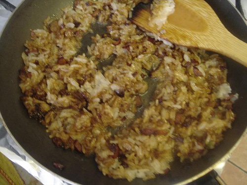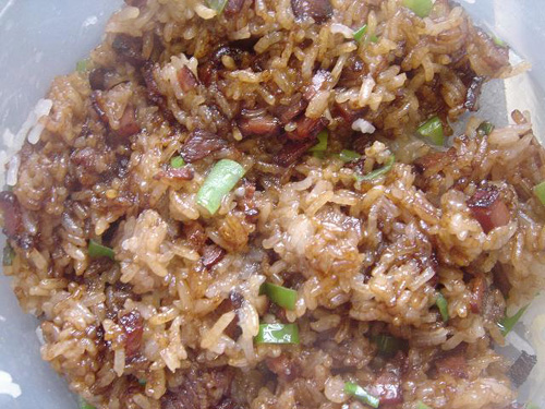 4、炒臘肉,把蒸好糯米放入,加生老抽雞精鹽(少許)料酒翻炒,加蔥出鍋