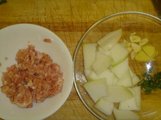 材料:豬肉餡(要有肥有瘦的)、冬瓜、澱粉、生抽、紹興酒、蔥末、蒜片、薑片、鹽、雞精少許。